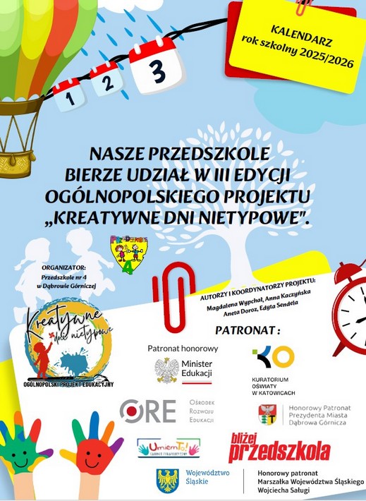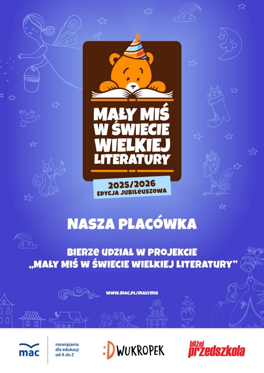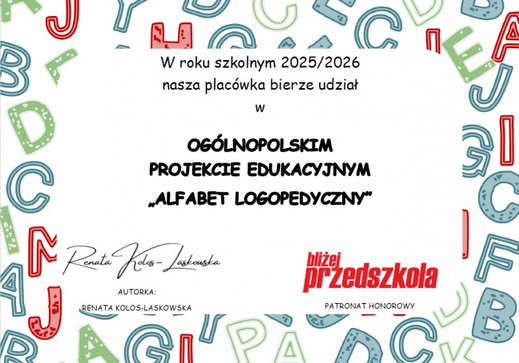 W roku szkolnym 2025/2026 oprócz podstawy programowej wychowania przedszkolnego w naszym przedszkolu dodatkowo, realizowane są ogólnopolskie projekty i programy edukacyjne i aktywizujące, a wśród nich: "Alfabet logopedyczny", "Gramy zmysłami", "Kreatywne dni nietypowe", "Zdrowo i sportowo" oraz "Mały miś w świecie wielkiej literatury".